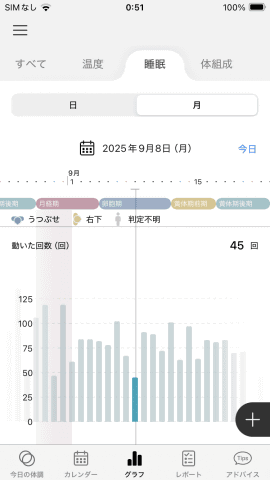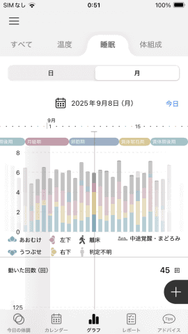 睡眠状態は、寝ている間の姿勢や体動の回数までわかるのがやはりおもしろい。健康や生活習慣の改善には、わかりやすい指標が必要。無意識な睡眠中の状態を把握することはなかなか難しいが、「リズムモニター」ならこれを手軽に実現できる。