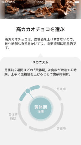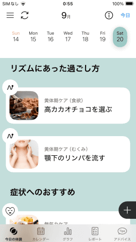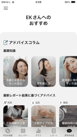 アプリでは、その日の気分や体調(むくみ、腰痛、ほてりなど)なども入力できる画面が用意されている。不調がある項目をチェックすると、すぐに対応するアドバイスがホーム画面に表示されるのも参考になる。アドバイスをもとに「今日はこうしよう」という行動変容やブレイクタイムにつなげられる。排便の有無、飲酒の有無なども記録できるので、「最近なんか調子悪いな」と感じた時に振り返ることができ、参考になる。