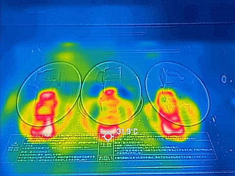 そこで、まずはこんにゃくを置いた皿を3枚並べて1分間加熱し、一般的な1基構造のレンジとの違いを比較してみました。熱の分布がわかるサーモグラフィーを比較したら結果は一目瞭然。「こんなに違うの?」と驚くくらいES-LA30の熱ムラが少ないのがわかります。
