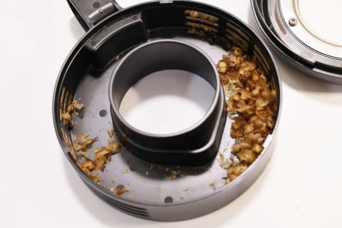 基本的なお手入れは、使い終わったあとにチャフコンテナに溜まったチャフ(薄皮)を捨てるだけ。飛び散ったチャフの掃除をする必要もなく、すごくラクでした。ただ、チャフをキレイに取ろうと思うと、付属のブラシで掃除しても微細なカスが残りやすく、完全にキレイに仕上げたい場合は少し面倒に感じるかもしれません。
