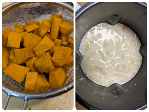 まず作ったのは、カボチャと玉ねぎを使った「パンプキンポタージュ」です。水や牛乳、バターに塩を加えた、ごくシンプルなレシピ。カボチャと玉ねぎは細かくカットします。カボチャの皮を剥いたり、小さくカットするのは結構大変なのですが、事前に使う分だけ電子レンジで温めると、皮が剥きやすくなったり、切りやすくなるのでおすすめです!