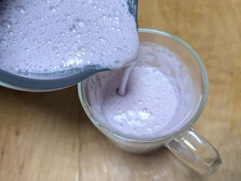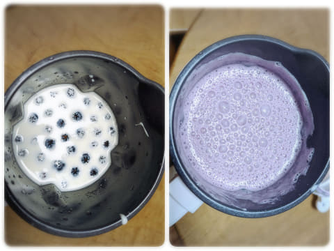 続いて作ったのはブルーベリーのヨーグルトスムージー。ブルーベリーにヨーグルト、牛乳、氷を入れただけのごくシンプルなものです。つぶ感は残っているものの、ブルーベリーの皮の舌触りはほとんど感じない、飲みやすい一杯が完成しました。