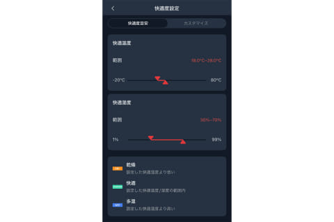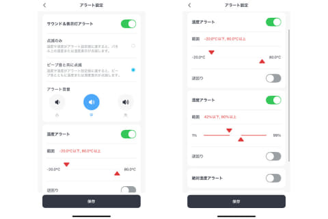 アラート機能は、設定した温度・湿度の範囲を外れると「警告音」「数値の点滅」で知らせる仕組み。たとえば「湿度が40%を下回ったら知らせる」と設定しておけば、アラートによって加湿器のスイッチを入れるタイミングを逃さずに運用できます。