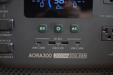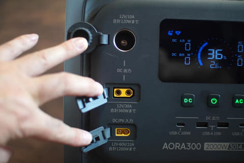 AC出力は基本的には2,000W、ピーク4,000Wあるので、一般家庭の40Aの半分ぐらいはここから賄うことができる。調理家電をいっぺんに使うとブレーカーが落ちて困るというご家庭は、コンセントと調理家電の間にAORA 300をかませておくと、ブレーカーが落ちる心配もなく快適に使える。電気ポットとトースター、炊飯器ぐらいは余裕で動かせる出力の高さは魅力だ。