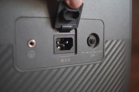 AC入力は右側面にある。安全のために20Aのがっちりしたサーキットブレーカーが付いているのは、ポータブル電源としては珍しい。入力は最大1,500Wで、これは日本の家庭におけるACコンセントの出力に合わせてある。