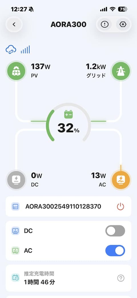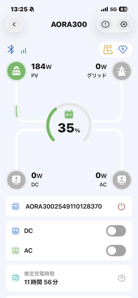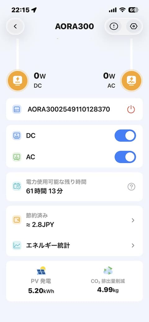 「AORA 300」のコントロールは、BLUETTI製品共通の専用アプリで行なう。トップ画面は一般的な入出力の状態と、AC/DCのONとOFFがリモートで切り替えられるスタイルだ。