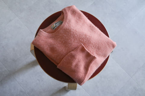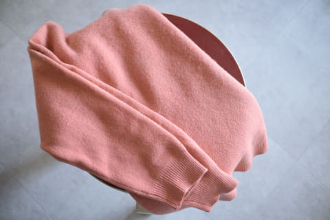 続いて、古着屋さんで買ったコーラルピンクのニットを。カシミア素材の肌あたり良いニットで、すごく気に入っているのですが、素材が良いだけに手を出すのが躊躇われる一枚で……。古着だから、生地自体が弱っている可能性もあるだろうし、ハサミでゆっくり切っていくしかないかなと思っていました。