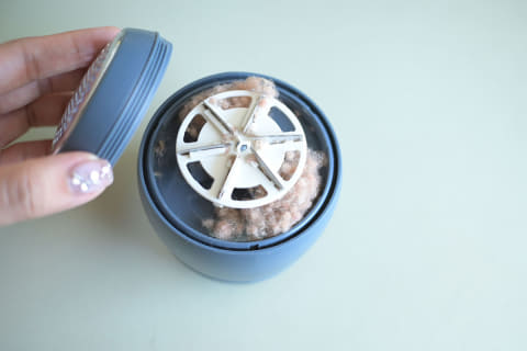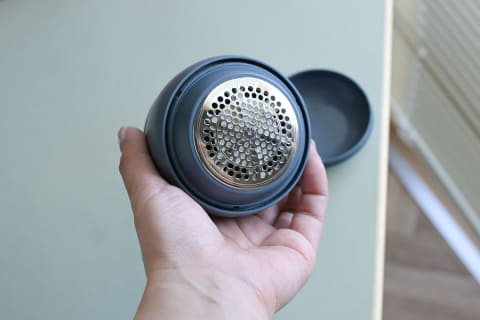 本体の上蓋を開けると、カットした後の毛玉くずが溜まっています。今回はだいぶ毛玉がついていたこともあり、2枚のニットをケアしたら、こんもりと溜まりました。使ったらすぐ取り除くようにして、いつでも使える状態をキープしたいですね。