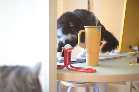 だからこそ、デスクの上に置ける卓上加湿器は魅力的なのですが、もうひとつ悩みがありました。それが「倒す未来が見える」問題。我が家には2匹の猫がいるのですが、彼らの物を落としたい衝動というのはすごいんですよね。もう執念というか。
