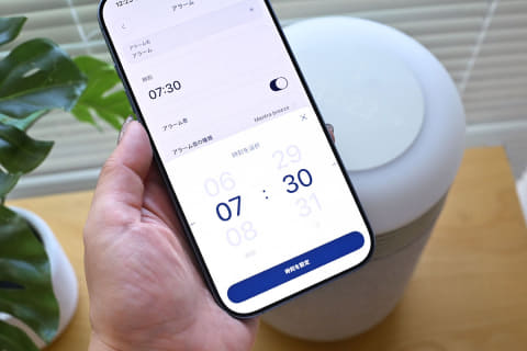 アプリで設定できる機能のひとつが「サンライズクロック」。今回の本題である、“眠りと目覚めをサポートする”機能です。いわゆるアラーム機能で、音と光によって自然な起床を促してくれるのだそう。