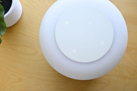 ちなみに、アラームで使ったライト機能は単体でも使えます。天面のタッチ操作で「1」か、アプリで10%未満に設定すると、就寝前の間接照明としてちょうどいい明るさに。