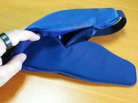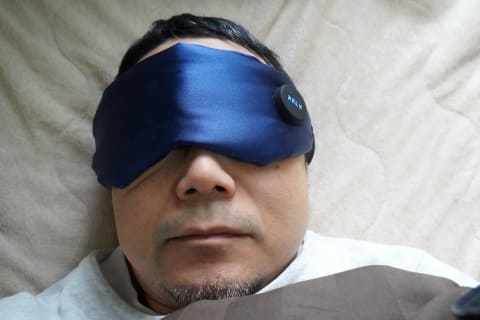 充電式なので、バッテリーや発熱する素材が本体内部にはあるはずですが、触った印象は、飛行機の中などでよく使用される布素材のアイマスクと大きな違いは感じられません。重量は実測値で約66gで、装着しても機械的な重さを感じないほど軽いです。