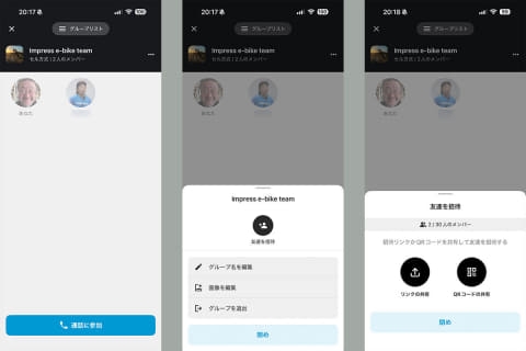 アプリのスクリーンショットを並べましたが、インカムとして使うならアプリのトップ画面の「インターコム」をタップする程度で使い始められます。インカムとして利用する場合、まずはグループを設定し、そこに参加する友達(メンバー)を招待する必要があります。難しい操作はなく、筆者的見解ですと「LINEで“友だちを追加”したことがあればすぐできる」くらいの難易度です。