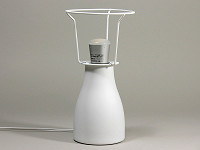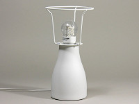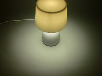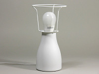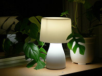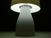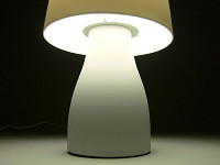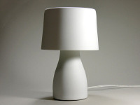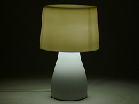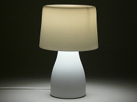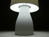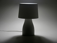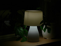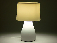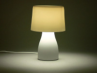 パッケージの中には、白磁製のベースとセード、それに40Wタイプの明るさを持つE17口金の電球形蛍光灯が同梱されている。組み立ては簡単で、ベースに電球を取り付け、金属のシェード受けに白磁のセードをそっとかぶせる。あとは好きな場所に置いて点灯するだけだ。