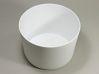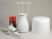 | 箱の中には白磁製のベースとセード、それに明るさ40Wタイプの電球形蛍光灯(東芝製・電球色)が同梱されている。1.8mの電源コードには中間スイッチがついている | まずは同梱された電球形蛍光灯を取り付ける。シェード受けの高さは95mm | 白磁製のセードの厚みは約2mm。割れやすい素材なので扱いはくれぐれも丁寧に |