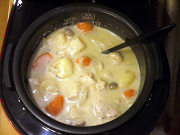 次は洋風メニューから、クリームシチューをお試し。市販のルーを使えば、そこそこ手軽に作れるものですが、これは、小麦粉とバターでホワイトソースから作るタイプ。鍋で作ろうとすると意外と面倒ですし、何より失敗しがちなメニューです。そんなクリームシチューも、ボタンひとつで簡単に作れます。