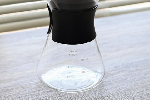 サーバーには「必要なお湯の量」と「抽出後のコーヒー量」の目安がプリントされており、計量カップいらずで準備がスムーズ。200mlのコーヒーを淹れるなら、サーバーの240mlラインに合わせてお湯を用意すればOKです。