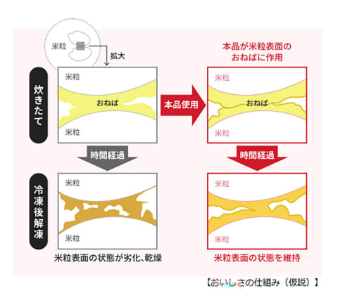 なぜ、ごはんがふっくら・しっとり仕上がるのでしょうか。ミツカンによると、本品がごはん表面の「おねば」に作用し、表面をしっかり包み込むことで実現しているのだそうです。