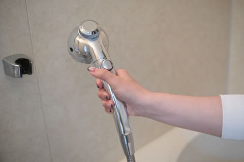 持ち手の部分には、「水量調節ダイヤル」と「手元ストップ」がついています。シャワーヘッドの性能に加え、手元で水の量や出方もコントロールできるから、より高い節水効果が期待できそうです。