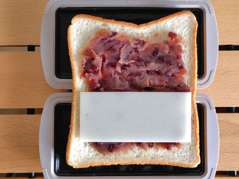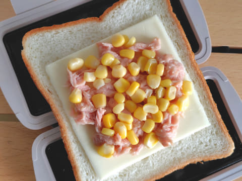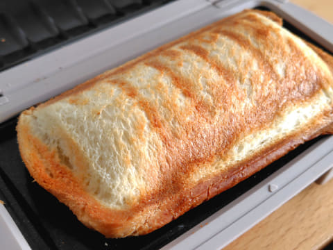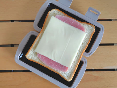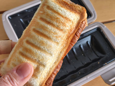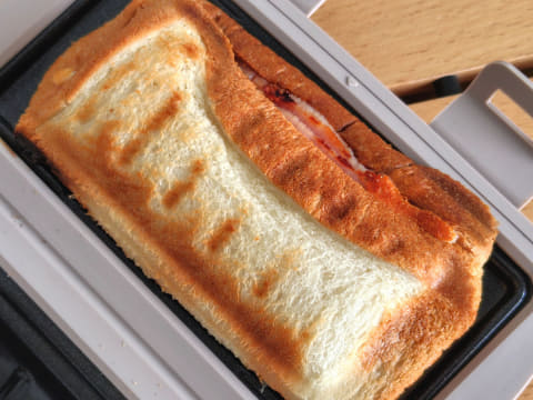 耳同士をうまく重ねるには、具材をのせた食パンを、2枚のプレートで左右両側からプレスするように挟むのがポイント。このとき、パンをしっかり中央で折り曲げることで、耳の位置もきれいに合います。