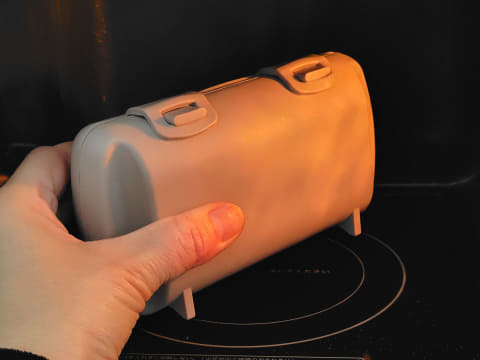 使い方はとても簡単です。本体を開いて、2枚のグリルプレートを覆うように食パン1枚を置き、好きな具材を中央にのせたらプレートを閉じて、本体に付いている留め具でロック。電子レンジの庫内に立てた状態でセットし、500Wで4~5分(600Wの場合は3~4分)加熱すると、ハーフサイズのホットサンドが焼き上がります。