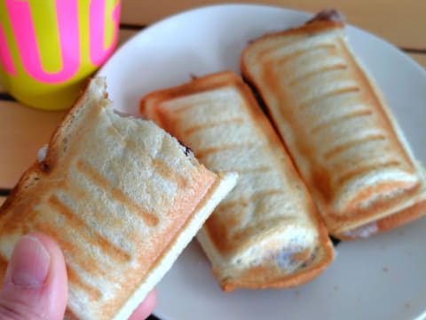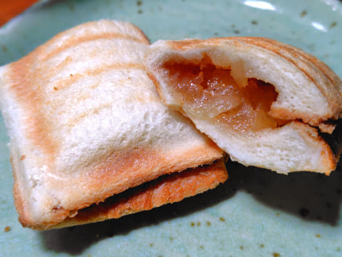 使用する具材を自由に選べるのも、手作りのホットサンドならでは。筆者の子供は、あんこと餅(しゃぶしゃぶ用の薄くスライスされたもの)を使った和スイーツ風、りんごジャムとシナモンをはさんだアップルパイ風のホットサンドがお気に入りです。どちらも出来立ては中がかなり熱くなっているので、少し冷ましてから食べるのがおすすめです。