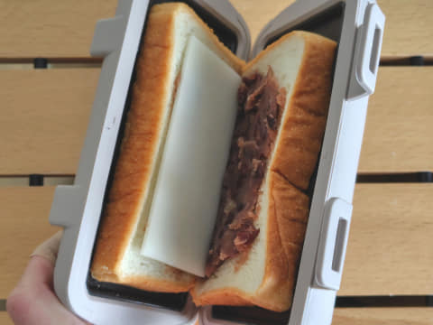 キャンプ飯でも親しまれる「ホットサンド」。食パン2枚を使い、間に好きな具材を挟んで、直火式あるいは電気式の専用メーカーで焼き上げるのが一般的です。