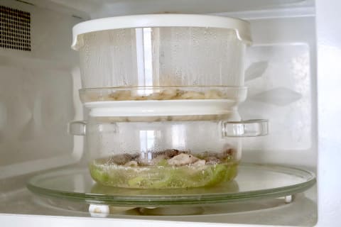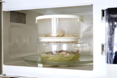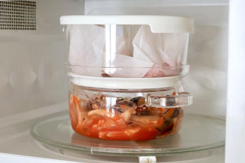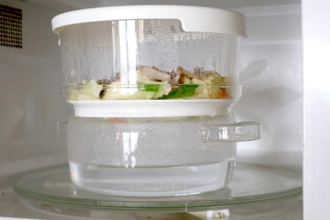 使い方は簡単です。ガラスせいろの下段に300mlの水を入れ、その上に上段を重ねて中に食材を並べたら、フタをして電子レンジにセット。あとは、600Wで6分加熱するだけ。