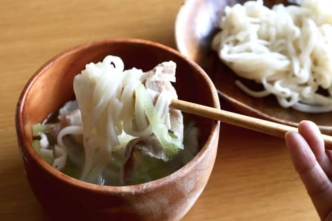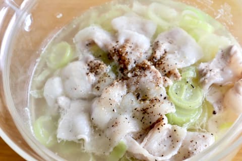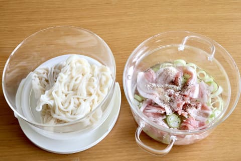 2品目は、「ねぎ塩だれのつけうどん」。実は筆者、竹せいろで蒸すうどんのおいしさにハマっていました。このガラスせいろを使えば、上段でうどん、下段でつけダレを同時に作れます。しかも、電子レンジで7分(600W)加熱するだけ。