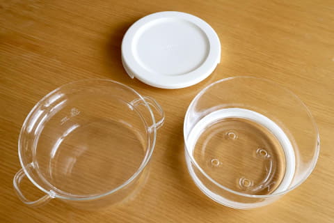 我が家に届いたパッケージを開封すると、構成は至ってシンプル。耐熱ガラス製の本体は2段構造になっていて、専用のフタが付属します。