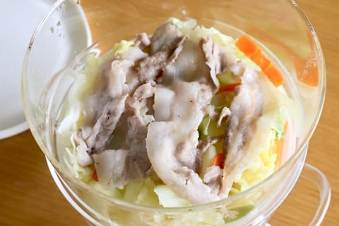 ものは試し、早速使っていきましょう。まずは基本から、オーソドックスに野菜と薄切りの豚バラ肉を蒸してみました。