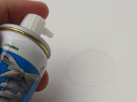 | スプレーは靴ヒモの結び目部分にする | スプレーの目安は結び目が湿る程度 | スプレー自体は無色透明だ。写真は紙にスプレーをしたところ |