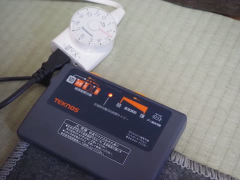 ちなみに2畳のホットカーペットは、全面/右半分/左半分で、あたためる範囲を切り替えられる。さらに温度を弱〜強に無段階で調整できる。タイマーは非搭載なので、以前からこたつに使っていた外付けのタイマーを、そのまま転用。切り忘れることもない。