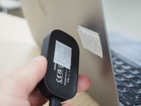 ただし、USBケーブルで接続しているため、外出先などテーブルがない場所でパソコン作業する際には邪魔になる。そこでダイソーでマジックテープ(ファスナーテープ)を買ってきて、パソコン画面の表側に貼り付けることにした。これまでも、メモリーカードリーダーを同様に貼り付けていたので、パソコン画面側はそのままで、SSDメモリーの本体側に新たにマジックテープを貼り付け、それをパソコン画面にペタッ。見た目は悪いがとても便利。