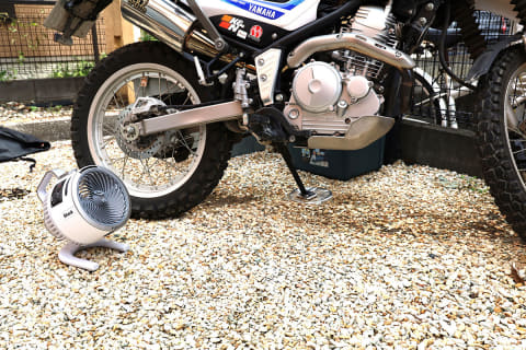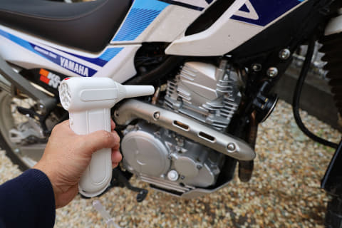 サバゲーだけでなく、バイクの洗車時にも重宝している。筆者はオフ車に乗っており、オフロードを走行した時はバイクがホコリまみれ、泥まみれになる。そのため割と頻繁に洗車するのだが、エンジン周りなど入り組んだ場所は拭き上げができず、そのままだとサビの原因になるから気になっていた。ジェットファンなら、こうした手の届かない隙間の水分を吹き飛ばすのにちょうどいいのである。