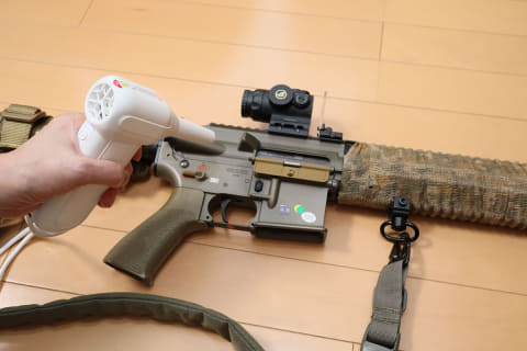 それに対して、ジェットファンは充電式なので気軽に使えるのがいい。電動ガンだけでなくウエアやベルト、マスクなどの装備一式にガシガシ使ってスッキリきれいになる。
