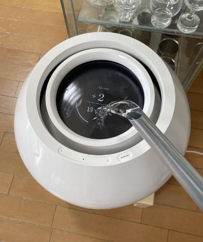 待つこと、約2週間。わが家に届いたRainは、壺の形という意匠は生かしながら、より暮らしに寄り添った仕上がりになっていることを実感させられました。電源を入れるとチェロの響きが静かに空間を満たし、高精細なディスプレイには給水のたびに緩やかに泳ぐ金魚が映し出されます。いつも泳いでいるのではなく、給水やモード設定などRainと関わりを持つときだけに登場するという仕掛けが何とも見事。