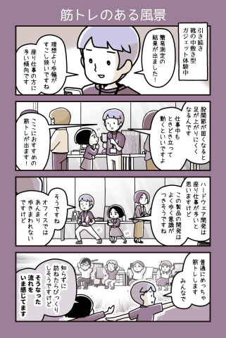 カデーニャカンパニー第370回:筋トレのある風景 たき りょうこ2025年12月24日 11:05ハードウェアスタートアップ企業、カデーニャカンパニー。広報の新人・原わかばには奇妙に見える事も、エンジニア達にはいつもの事。ハードウェアスタートアップあるある4コマ漫画。画像はクリックで拡大します。※この物語は事実に基づいたフィクションですたき りょうこ漫画家/ライター/イラストレーター 元SE。 エキレビ!にてイラストレビュー、学研『はじめてのプログラミング』漫画担当など。 Twitter: @ryoko_t3