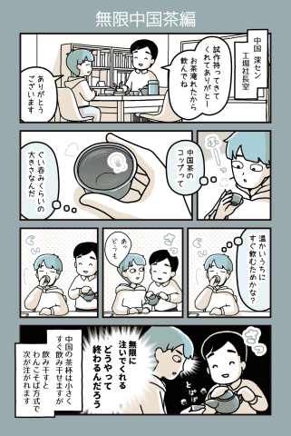 カデーニャカンパニー第378回:無限中国茶編 たき りょうこ2026年3月4日 11:05ハードウェアスタートアップ企業、カデーニャカンパニー。広報の新人・原わかばには奇妙に見える事も、エンジニア達にはいつもの事。ハードウェアスタートアップあるある4コマ漫画。画像はクリックで拡大します。※この物語は事実に基づいたフィクションですたき りょうこ漫画家/ライター/イラストレーター 元SE。 エキレビ!にてイラストレビュー、学研『はじめてのプログラミング』漫画担当など。 Twitter: @ryoko_t3