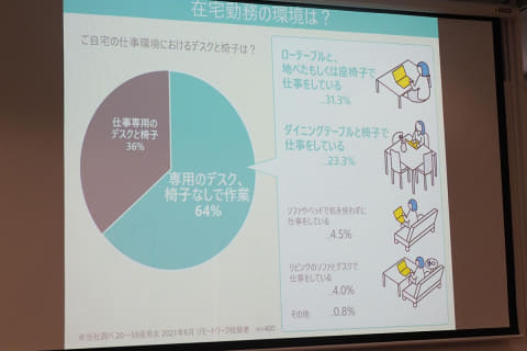 同社調査によれば、在宅勤務時のデスクと椅子について、31.3%もの人が「ローテーブルと、地べたもしくは座椅子で仕事をしている」とのこと。ダイニングテーブルと椅子で仕事をする人も23.3%いたという。