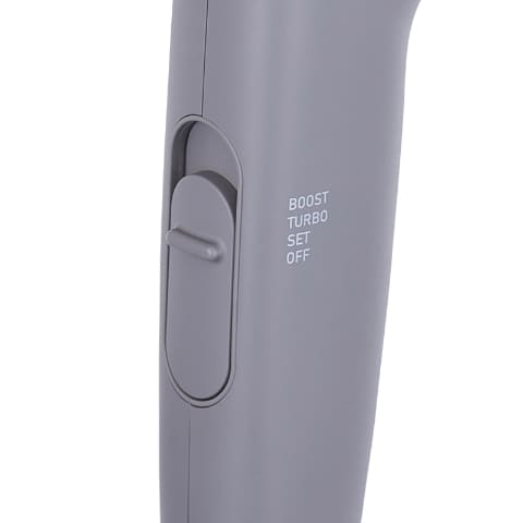 電源のオン/オフを兼ねる、風量切替スイッチは、スライドさせることで「BOOST(温風強)/TURBO(温風中)/SET(温風弱)/OFF」を、切り替えられる。また温度切替スイッチは、温風使用中に同スイッチを押すたびに、「HIGH/LOW/COOL」が切り替わり、ランプがそれぞれ「赤/橙/青」で点灯する。