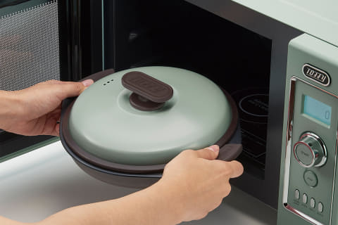 電子レンジに入れるだけで、焼く、炒める、蒸す、茹でる、炊く、煮るなどの調理ができる1台6役の電子レンジ調理専用鍋。本体底面の特殊素材が電子レンジのマイクロ波を熱に変換する仕組みで、火を使わなくても焼き目がついた本格的な料理が完成するという。