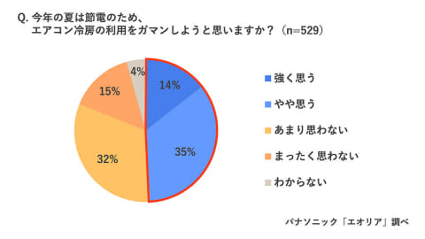 一方で、電気代の高騰を受け、節電意識の高まりも顕著になっている。実施した調査では、「電気料金値上げの負担を感じる」と回答した人は87%にのぼり、「今年の夏は冷房を我慢したい」と答えた人は49%に達した。