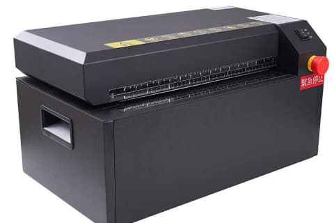 卓上に収まるコンパクト設計で、オフィスや倉庫の限られたスペースにも設置しやすい仕様。使用方法は簡単で、スイッチ操作のみで段ボールの裁断が可能。最大で390×8mm(幅×厚さ)までの段ボールに対応し、加工速度は毎分約5.5m。安全面にも配慮されており、緊急停止ボタンを搭載するほか、温度ヒューズと電流ヒューズによる安全装置も備える。