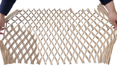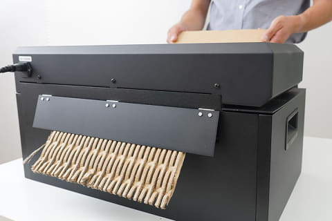 廃棄予定の段ボールを再利用して、梱包用の緩衝材を製造できる段ボールシュレッダー。使用済みの段ボールを網目状に裁断することで、そのまま緩衝材として再利用可能な資材へと生まれ変わらせる。