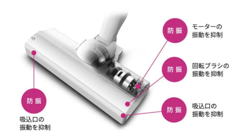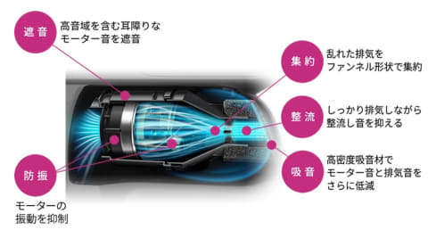 本体のモーター音や排気音、駆動音を抑える「ノイズリダクション設計」により、RACTIVE Air史上最小クラス60dBの運転音を実現。ファンネル(円錐)形状の遮音カバーでモーターを覆い、排気の出口付近に吸音材を設置した「ファンネルサイレンサー」を搭載するとともに、吸込口の駆動音を抑える「ダンピングコントロール」により、運転音の低減と運転音に含まれるキーンとした耳障りな音を抑制する。