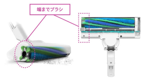 また、効率の良い軽量高出力モーターを搭載しており、RACTIVE Air史上最強の吸引力を実現。吸込口の端までブラシが届く構造の「端までブラシ」をヘッドに備え、壁や家具のキワなどに沿って動かすだけで、回転ブラシでかき取りながらごみを吸い取るという。