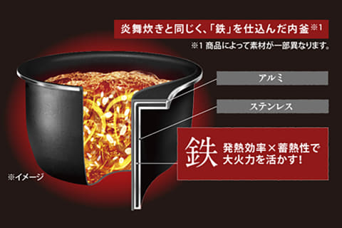 内釜には、発熱効率と蓄熱性にすぐれた「鉄(くろがね仕込み)豪炎かまど釜」を採用。IHとの相性が良い鉄を芯材とし、熱伝導率の高いアルミ層と耐久性にすぐれたステンレス層で挟み込んだ構造となっている。