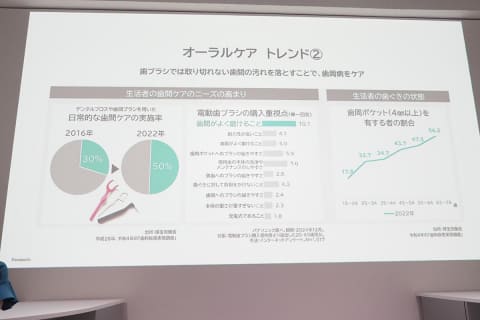歯間ケアの重要性に関する認識は高いものの、従来のヘッドが大きい電動歯ブラシでは細かい箇所が磨きにくく、手磨きを併用する人も多かったという。
