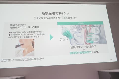 そこで新製品は歯周ポケットと歯ぐきケアの性能をアップさせ、ブラシの改良で歯のすき間まで入り込むようにした。